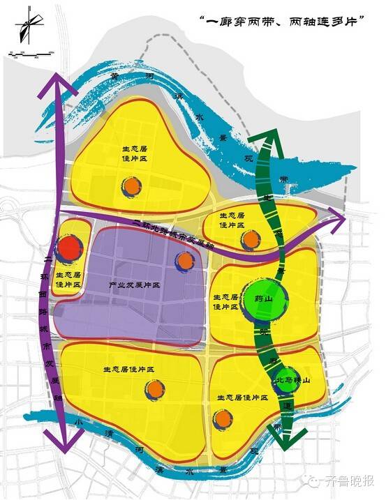 药山片区的功能定位为地区生产力服务中心,黄河、小清河观光游憩带重要载体,生态宜居的居住社区。