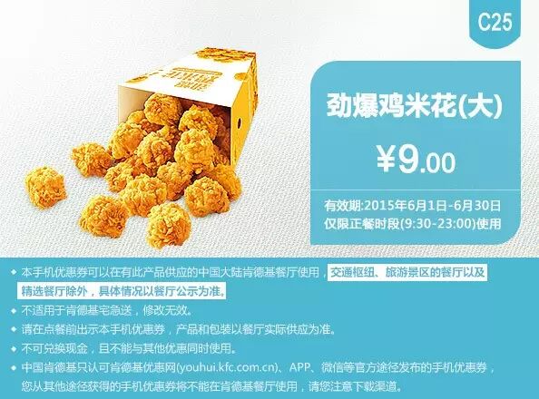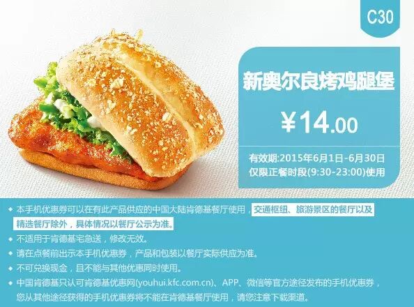 2.本手机优惠券可以在有此产品供应的中国大陆肯德基餐厅使用。交通枢纽、旅游景区的餐厅及精选餐厅除外,具体情况以餐厅公示为准。